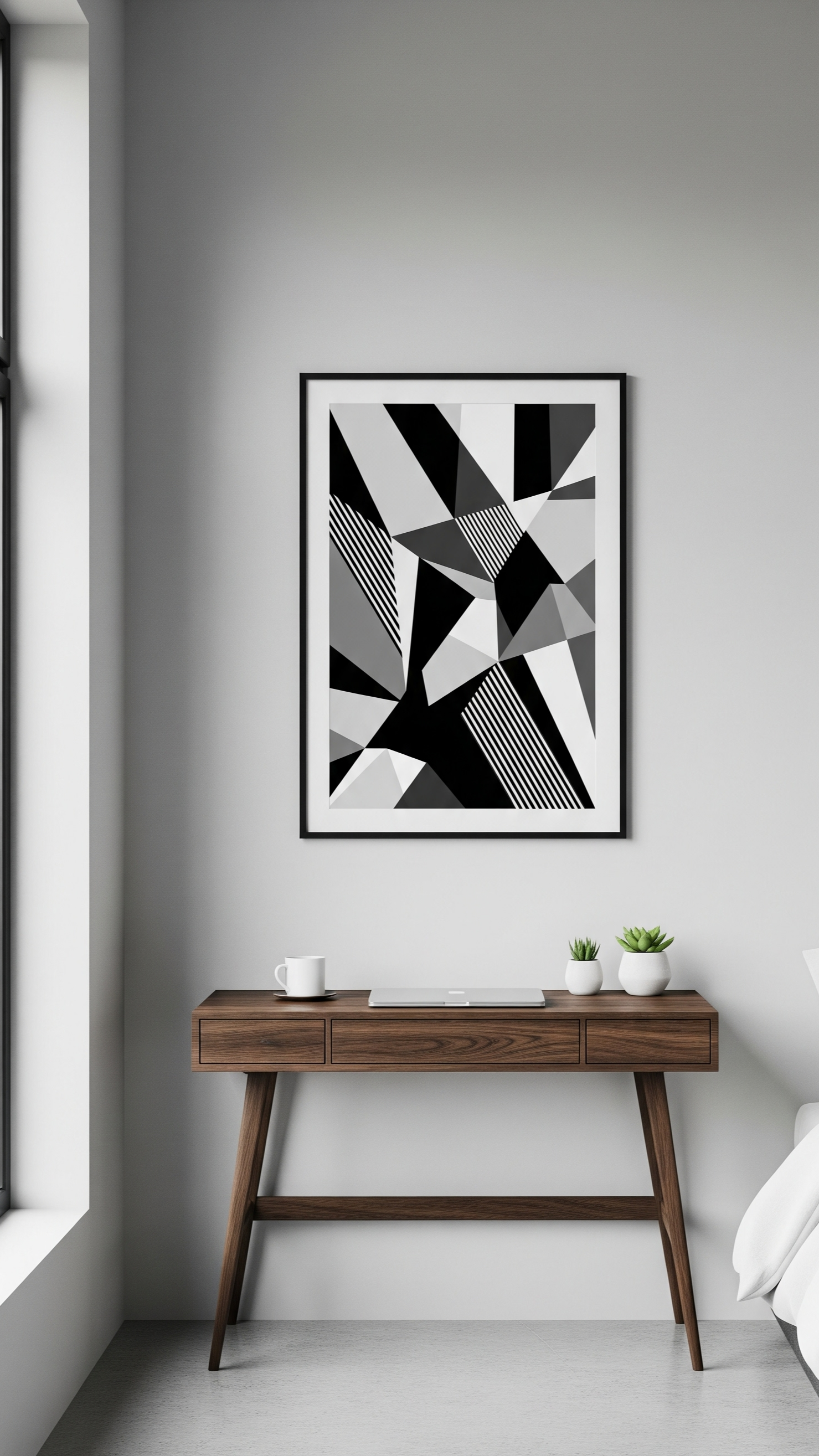 Minimalist doesn’t mean boring. Instead of filling the walls with too many frames, pick a single striking artwork or black-and-white print to elevate the design. The framed art above the desk in the inspiration image is a great example of understated yet impactful wall decor.