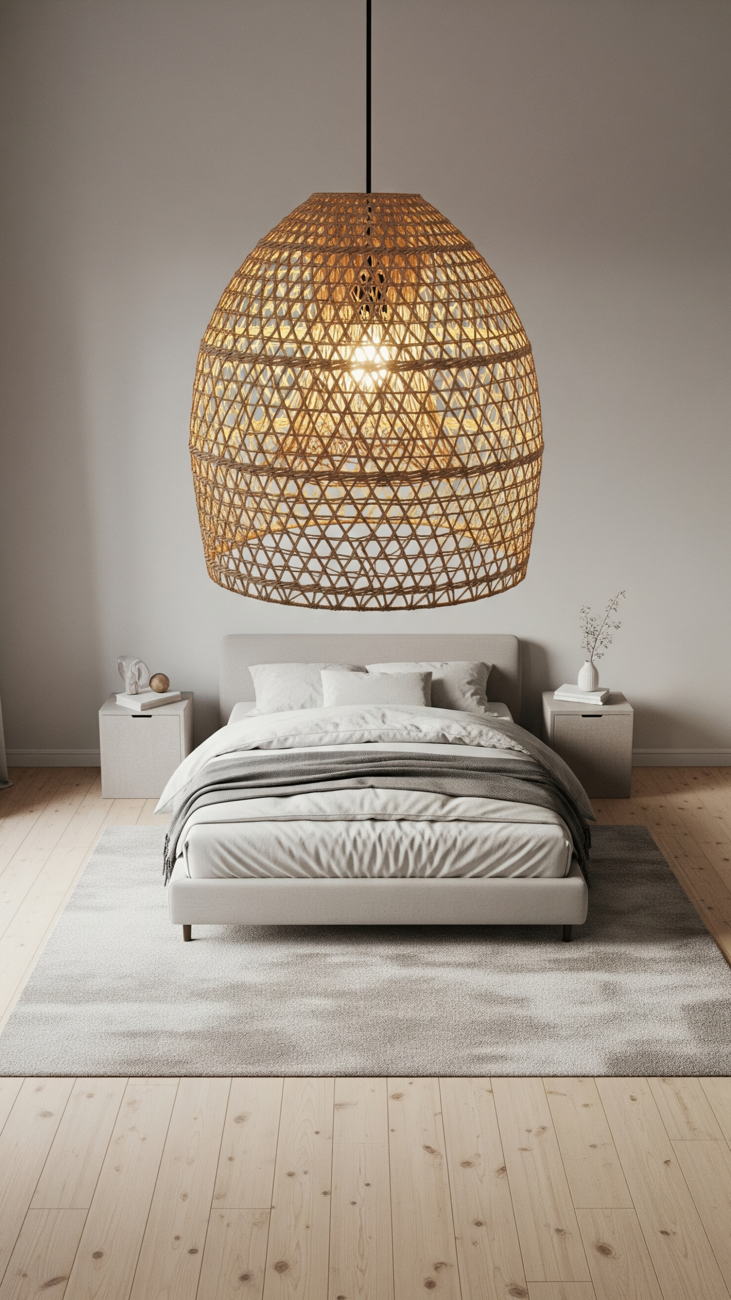 Lighting plays a huge role in setting the mood of a minimalist bedroom. Opt for layered lighting—ambient ceiling lights, task lamps for reading or work, and subtle LED accents. A woven pendant lamp adds natural texture and softens the modern aesthetic.
