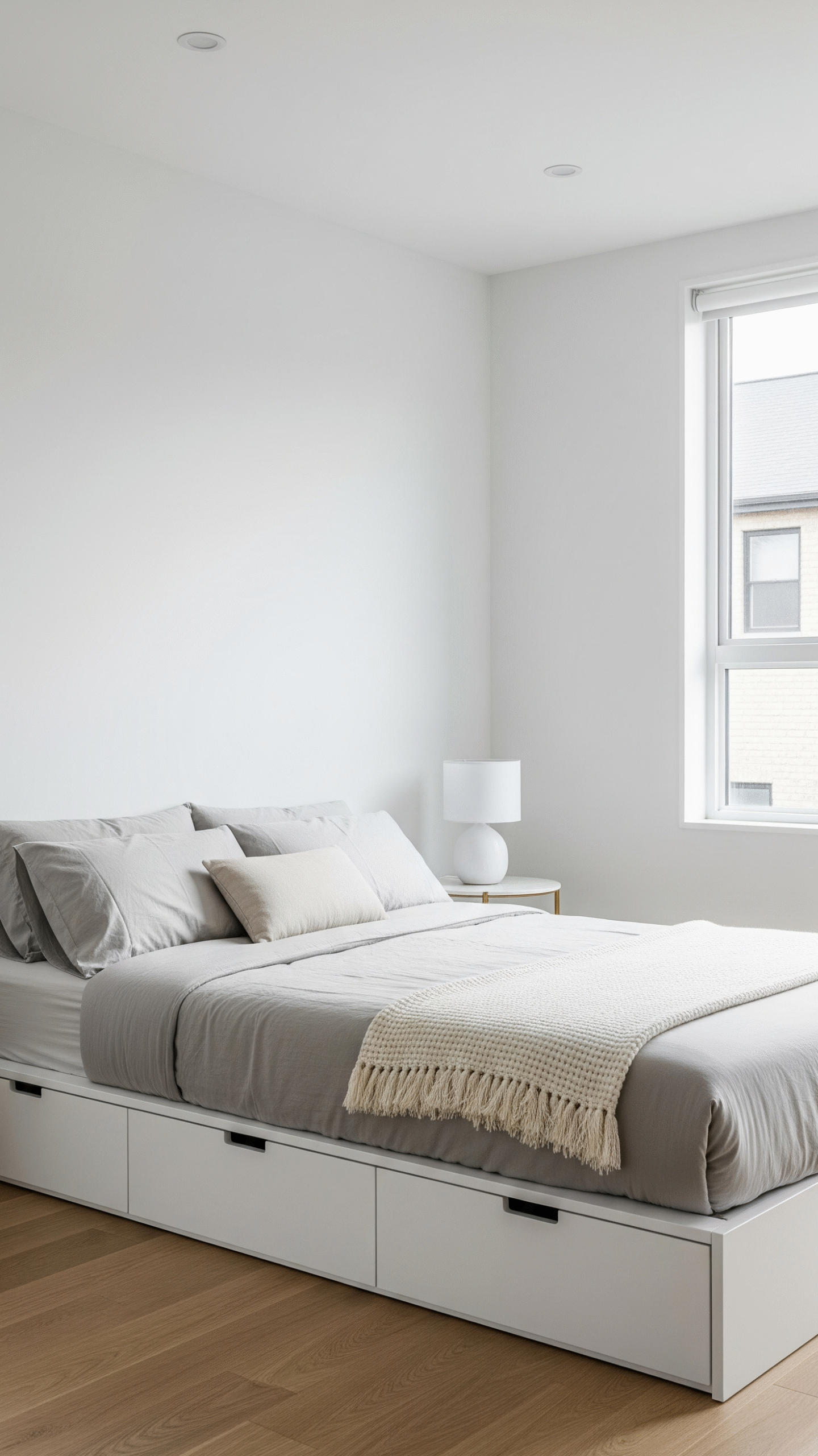 One of the key aspects of a modern minimalist bedroom is clever storage. Furniture such as platform beds with built-in drawers or floating shelves keeps the room organized while saving space. As seen in the example image, the bed with pull-out storage is perfect for keeping essentials hidden yet accessible.