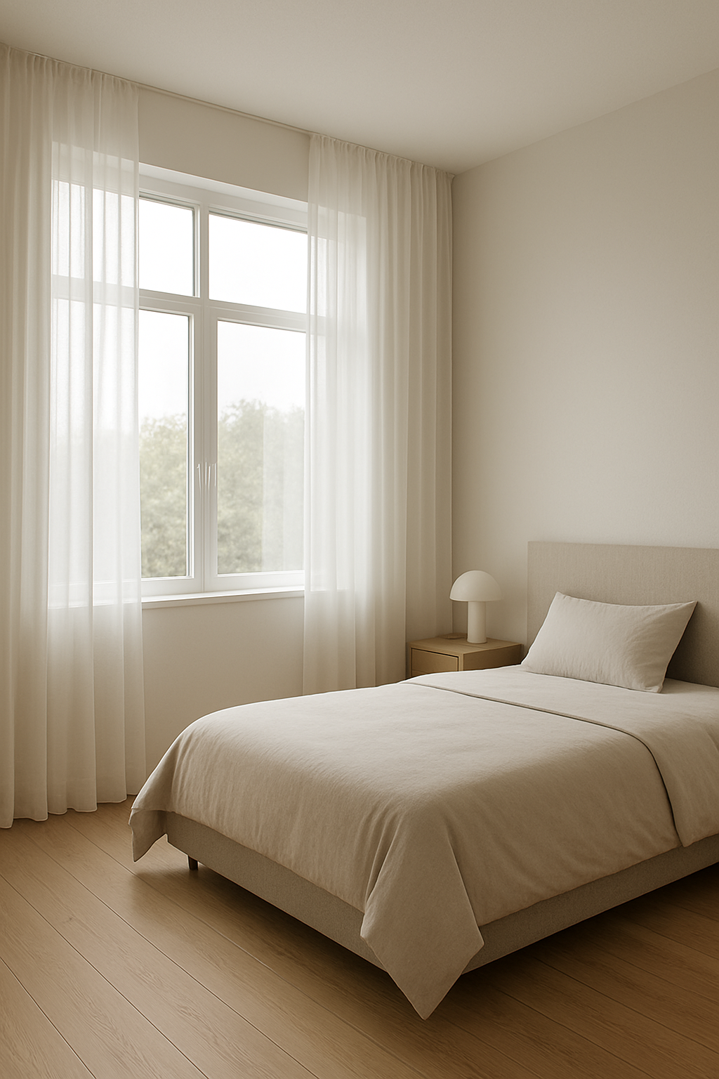Natural light enhances the airy feel of a modern minimalist bedroom. Large windows with simple roller blinds or sheer curtains let sunlight flood the room during the day while offering privacy when needed. Positioning your reading nook by the window is an excellent way to take advantage of daylight for reading or relaxing.